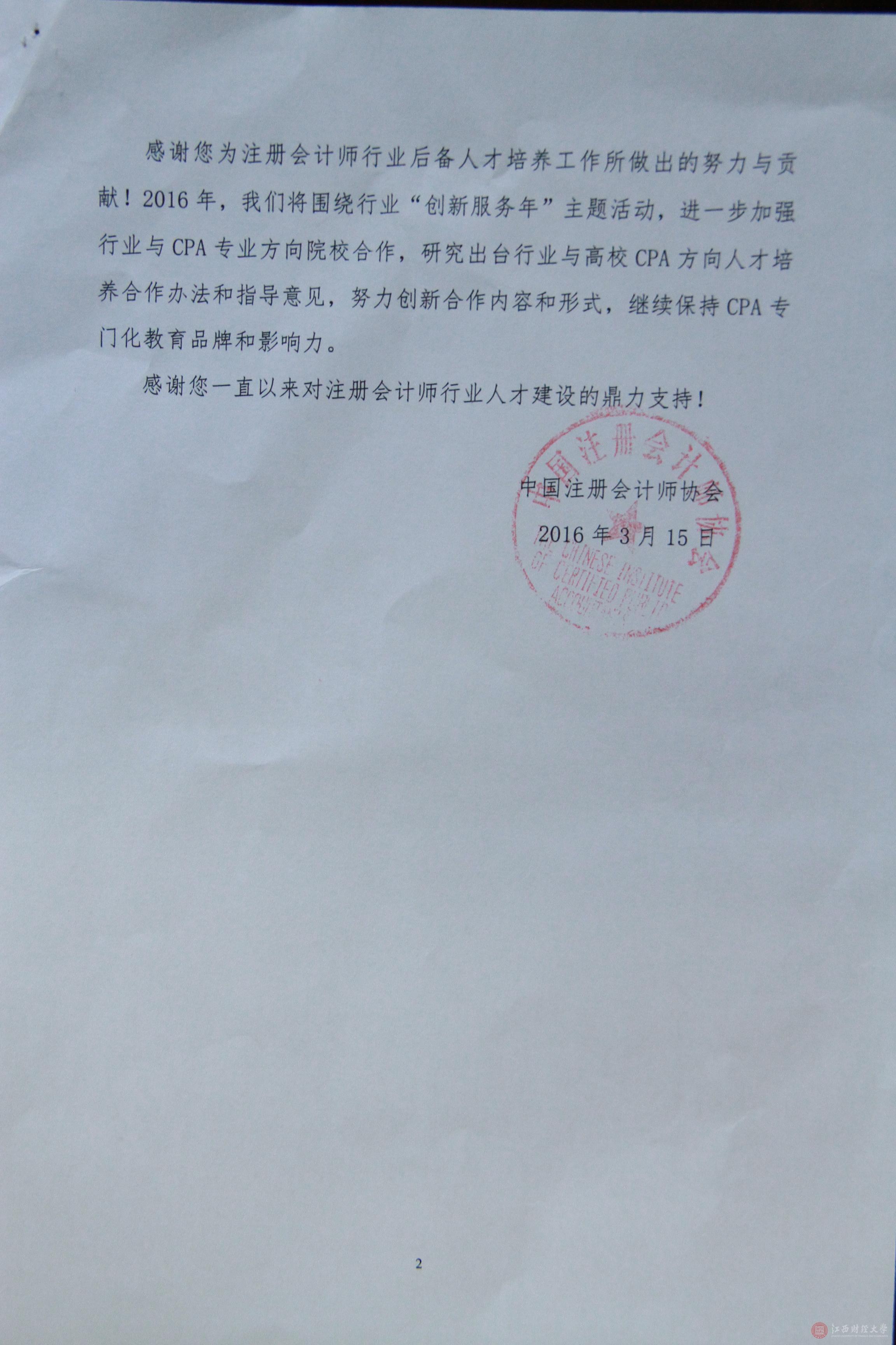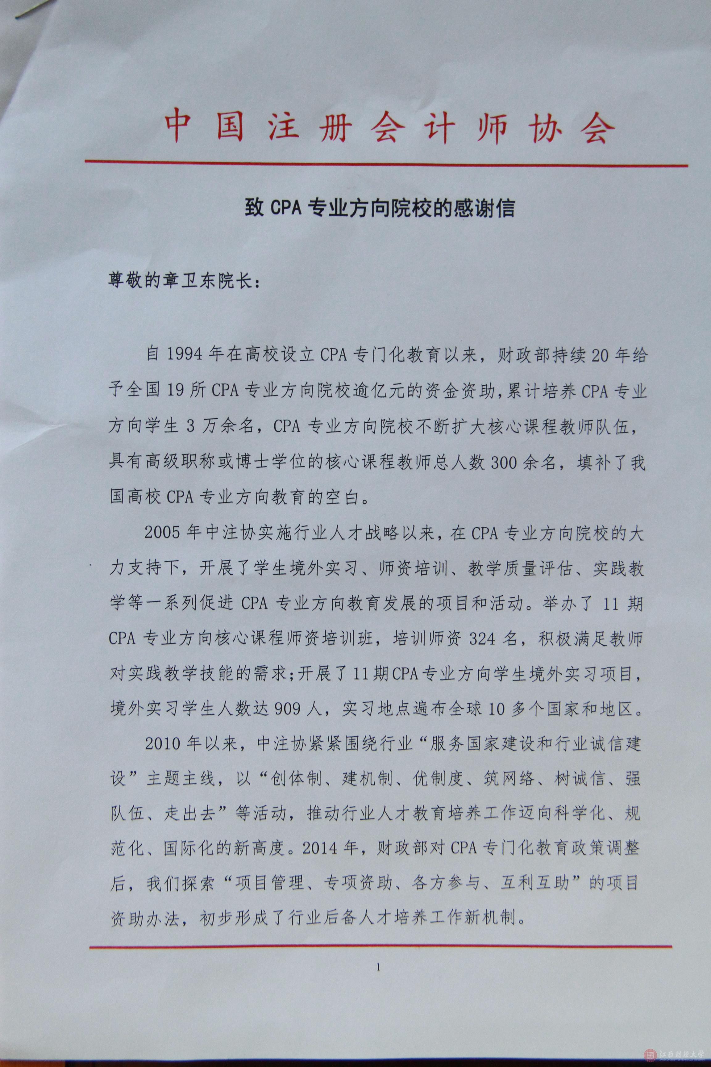 近日,财政部中国注册会计师协会发来贺信,对我校CPA专业方向办学成就进行高度赞扬与感谢。