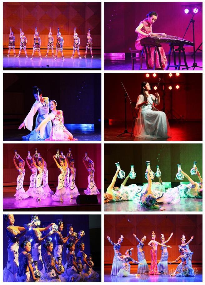主持人以一口流利的英文介绍开场,此次演出分三个篇章,灯光暗下后,第一个节目壮族舞《走在山水间》舞动着壮族人的奔放热情开启第一个篇章--“物华天宝人杰地灵”。随后是古筝独奏《云裳诉》,伴随着钢琴的配乐,凄凉哀怨地弹奏出“安史之乱”时马嵬坡前唐玄宗与杨贵妃的千般痛苦与万般悔恨,听来催人泪下。接着,女声表演唱一曲《请茶歌》对领袖、对老一辈无产阶级革命家的深情都在歌声的含蓄当中。舞蹈《化蝶》出自中国四大民间传说《梁祝》,舞者细腻地呈现了传说中梁山伯与祝英台唯美彻骨、惊天动地的爱情故事。