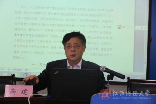 13日下午,高建教授作题为“两种不同的协商民主”的讲座。讲座由马克思主义学院院长陈始发主持,学院部分师生听取了报告。高建还是中国政治学会副会长、中国社会科学基金政治学学科评议组专家、中共中央马克思主义理论和研究工程项目《西方政治思想史》首席专家之一。