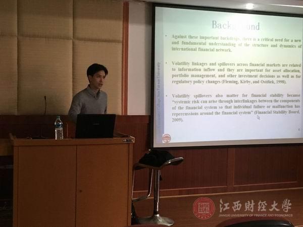 14日下午,杨子晖教授在金融学院作了题为Asymmetric Networks of Global Volatility Spillovers的学术讲座。讲座由金融学院院长汪洋主持,学院部分教师及研究生聆听了讲座。杨子晖教授介绍了论文的研究背景以及global volatility spillovers研究的意义,阐述了他论文的主要贡献。他从数据、方法和实证结果等几个方面对这篇论文进行了深入浅出的介绍,发现global volatility spillovers的结构是动态非对称的,并对研究结论进行了解释。在讲座最后,杨教授耐心地回答了在场师生的提问,和师生分享了如何撰写高质量的学术论文的经验,大大激发了在场师生的科研热情。(图文/曾良盛 张利国 邱晓平 毛梦麾 编辑/匡琳)