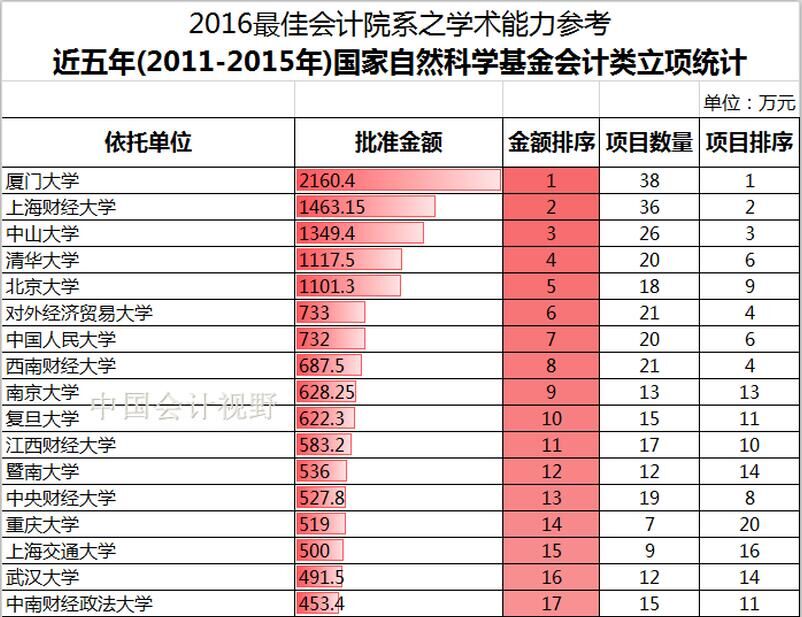 此次评价结果是“中国会计视野网”根据教育部第四轮学科评估指标体系,以国家自然科学基金立项数和立项金额为学术能力评价指标,对全国各高校的会计学科进行了评价。具体做法是:根据国家自然科学基金项目近五年(2011年至2015年)的申报与立项情况,对工商管理一级学科中的公司理财与财务管理、会计与审计两个二级学科申请的项目,分别按照立项金额和立项项目数进行排名。