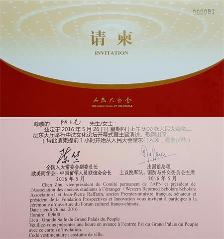 近日,为期一周的首届中法文化论坛在北京举行,曾留学法国巴黎的阳小毛教授应邀出席人民大会堂首届中法文化论坛开幕式,大会首先宣读了习近平总书记的致辞和法国总统奥朗德的贺信,国务院副总理刘延东出席并发表了热情洋溢的讲话,全国人大常委会副委员长陈竺,法国前总理拉法兰、政府与议会关系国务秘书勒甘等出席开幕式,法国巴黎副市长让·玛丽·勒干讲话。大会由嘉宾主持人杨澜主持,设计中国国家大剧院的著名法国设计师保罗·安德鲁做了精彩的演讲,卢浮宫金字塔的贝聿銘设计团队畅谈多种文明多国文化交融的设计理念,《狼图腾》的法国著名导演让·雅克·阿诺讲述了他在中国的创作经历,莫奈博物馆馆长帕特里克·德·卡洛里对文化的保护与传播做了主旨发言。中国著名艺术家范曾对中法文化和而不同相互补充做了精彩的演讲,法国里昂市长对接2017年的论坛主办地。
