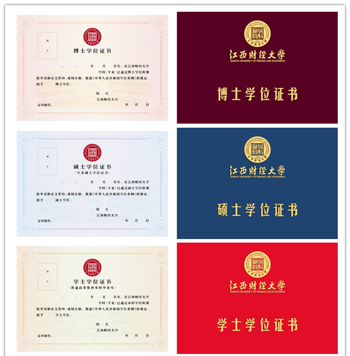 新版学位证书采用横版标准A4尺寸,按学位层次分为博士、硕士、学士三级,分别采用“暗红色”“蓝色” “江财红”进行颜色区分。除包含必要的学位授予信息外,还融合了江西财经大学校名、校训、代表性建筑等具有唯一性的文化符号。证书设计思路遵循庄重大气、规范安全的理念,做到经久耐用、精致美观、不可复制,保持基本风格的延续性和认知的一致性,突出江财元素,充分展现江财文化。