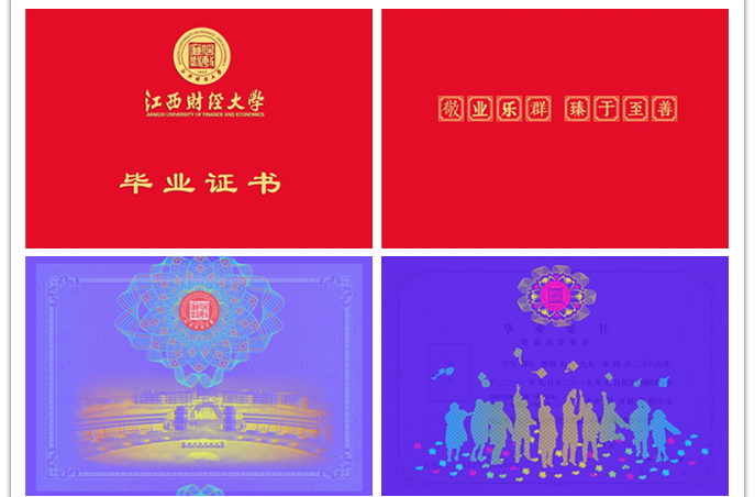 我校证书设计风格古朴典雅,采用传统花边与现代设计元素相结合的手法,用校内著名雕塑元素,突出江西财经大学校园文化。并与现代印钞防伪工艺相结合,采用了多种钞券印刷防伪工艺,特别是在荧光灯下双通道炫彩效果,极大地提升了证书的价值感和可信赖度,成为人生重要纪念的一份良好见证。