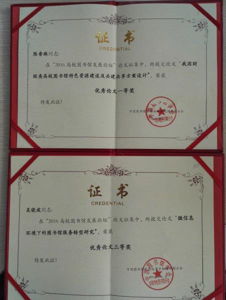 会议对“2016 年高校图书馆发展论坛”优秀论文及案例进行了表彰。我校图书馆陈香珠老师提交的论文《我国财经类高校图书馆特色资源建设及共建共享方案设计》荣获优秀论文一等奖,吴晓波老师提交的论文《微信息环境下的图书馆服务转型研究》荣获优秀论文三等奖。