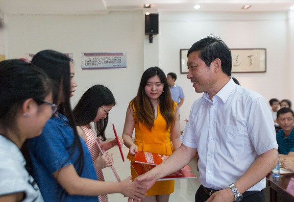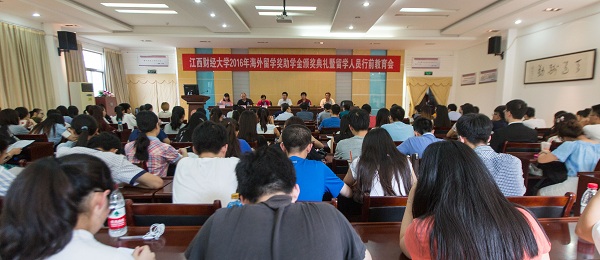 6月24日下午,2016年度海外留学奖助学金颁奖典礼举行。校党委副书记易小明、副校长王小平以及宣传部、学工处、校友联络办、教务处等职能部门负责人出席典礼并为获奖学生代表颁奖,颁奖典礼由国际合作与交流处处长肖珑主持。各学院党委书记、全体获奖学生以及即将赴海外交流的所有学生参加了本次颁奖典礼。