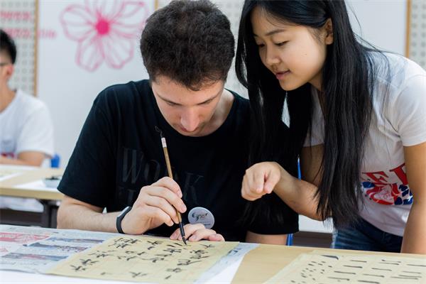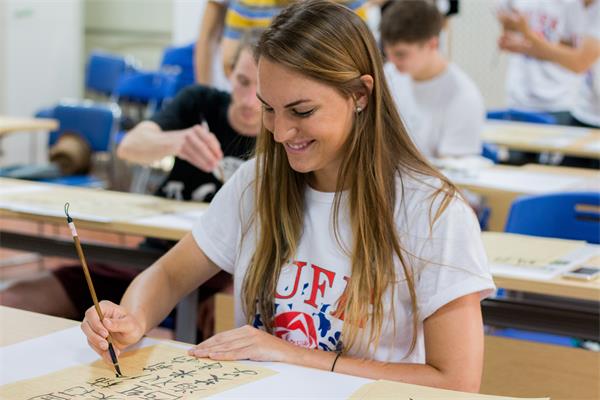 在书法课上,夏贤锋老师教大家用楷书、行书等不同风格的字体书写各自的中国名字,尽管毛笔的使用对外籍学生来说很陌生,尽管他们没法真正领会到书法的起承转合,但他们均乐在其中,尽情感受中国文字的魅力。