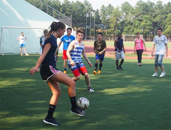 体育馆内,乒乓球协会的成员们悉心传授给外籍友人打乒乓球的要领和诀窍,在他们的指导下,不少外籍友人进步神速,都能与我们的同学打上几个回合了,看来小球运动也难不倒西方人民;足球场上的男女混合足球比赛更是赚足了观众的眼球,连场边的拉拉队都成了一道亮丽的风景,比赛双方势均力敌,战况十分胶着,最后以3:3平局完美收场,体现了 “和为贵”的中国传统文化精髓。