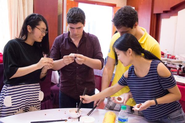 诚然,需要功夫的可不仅仅是太极拳,包饺子对大家来说也绝非易事,不过在中国学生手把手指导下,外国友人们的包饺子技术有了很大提升,一个小时的时间内,大家就包了近八百个形状各异的饺子。晚餐吃着自己包的水饺和煎饺,大家自然是别有一番滋味在心头。