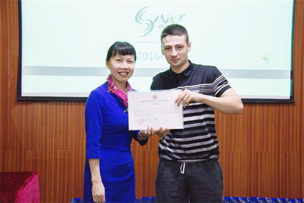 美好的时光总是那么短暂,转眼间,大家换上正装,就要参加国际夏令营的结业典礼了。在“Good Time”和“See You Again”的背景音乐衬托下,大屏幕上回放着的一张张照片引领我们回想到大家在一起学习、一起运动、一起参观、一起旅行的场景,在感到开心、温暖的同时,又是那样的伤感。肖珑处长给每位夏令营成员颁发了结业证书和纪念礼品,最后,她问大家“你们还会回来吗”,大家异口同声地给出了肯定的答案“Yes”。
