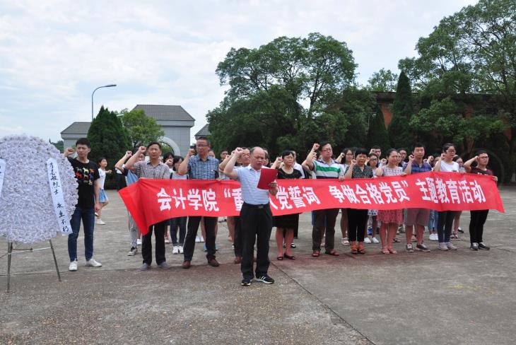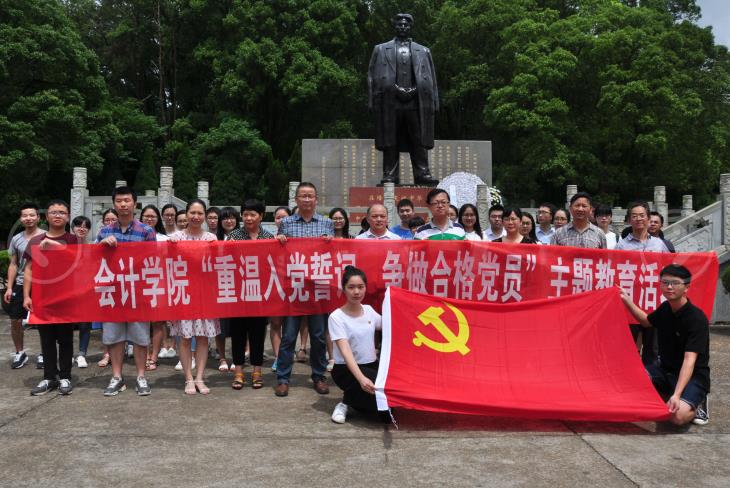 6月30日,在喜迎建党95周年之际,会计学院结合“两学一做”工作部署,组织教职工党员、学生党员50余人,前往方志敏烈士陵园开展“重温入党誓词,争做合格党员”为主题的活动,回顾红色历史,缅怀革命先烈,争做合格党员。在方志敏烈士头像前,全体党员庄严肃穆,列队整齐,向埋葬在青山下的烈士许下铮铮誓言:“我志愿加入中国共产党,拥护党的纲领...”在革命烈士陵园前重温入党誓词,表达了作为一名共产党员的崇高信仰和坚定信念。随后,党员们认真观看了馆内陈列的图片资料、实物、沙盘模型、绘画、雕塑展示等,共同回顾方志敏同志艰苦奋斗、浴血奋战、视死如归的生平和革命事迹,深刻体会方志敏同志矜持不苟、舍己为公、清贫朴素的美德和伟大精神。特别是在看到方志敏著作《我是一名共产党员了!》时,全体新党员看得仔细、听得认真、学得深刻,在思想和精神上接受了一次深刻的洗礼。