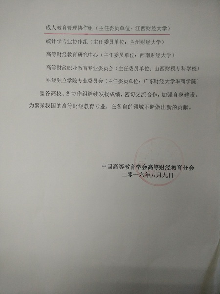 本次会议的主题是:交流各专业委员会或研究中心工作经验,总结布置各专业委员会或研究中心工作,表彰优秀专业委员会或研究中心。中国高等教育学会高等财经教育分会副理事长兼秘书长张国才首先致辞,接着,江西财经大学成人教育专业委员会等20个专业委员会代表在大会上作了经验分享介绍,我院黄泽友院长代表成人教育专业委员会作了“打造优质平台,发挥辐射作用”的经验分享报告。随后,西南财经大学党委副书记曾道荣、山东财经大学党委副书记张东超、内蒙古财经大学副校长侯淑霞、吉林财经大学副校长杨春梅分别作了讲话,中国高等教育学会高等财经教育分会副理事长兼秘书长张国财作了大会总结。最后,高等财经教育分会副理事长兼秘书长张国才宣读了“中国高等教育学会高等财经教育分会关于表彰先进协作组的决定”,31个专业委员会中的10个,工作成绩突出,受到表彰。江西财经大学成人教育专业委员会等10个专业委员会获得“先进单位”称号。 (图文/继续教育学院 黄文 编辑/姜莹)