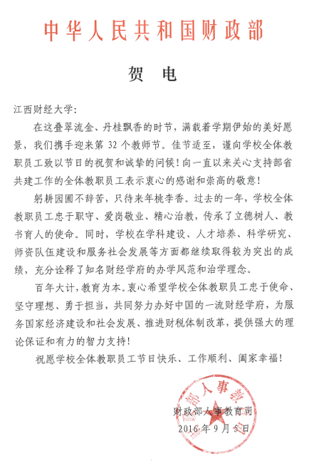 在第三十二个教师节即将到来之际,财政部人事教育司向我校发来贺电,向学校全体教职员工致以节日的祝贺和诚挚的问候!向一直以来关心支持省部共建工作的全体教职员工表示衷心的感谢和崇高的敬意!祝愿学校全体教职员工节日快乐、工作顺利、阖家幸福!