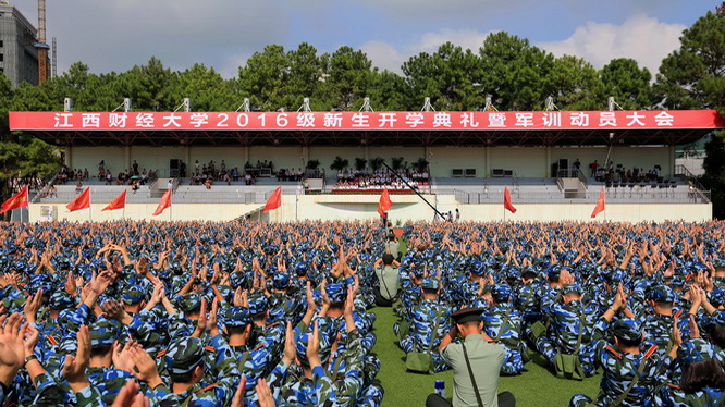 9月12日,雨后初晴的校园分外美丽。蛟桥园北区田径场上,身穿蓝色迷彩服的新生方阵整齐排列,2016级新生开学典礼暨军训动员大会在国歌声中拉开帷幕。承担此次军训任务的南昌陆军学院军训办主任马龙生大校、教练营营长陈丰收中校,我校长王乔,校党委副书记易小明,副校长蒋金法,纪委书记杨建林,副校长邓辉、王小平、阙善栋,校长助理李良智,校属各职能部门负责人,学院院长、党委、党组织书记,2016级新生、新生家长代表出席和参加。。