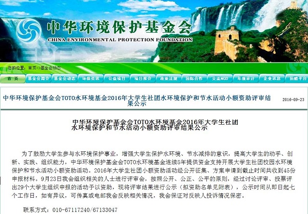 中华环境保护基金会TOTO水环境基金公布了2016年大学生社团水环境保护和节水活动小额资助评审结果公示。旅游与城市管理学院碧水行动协会申报的《南昌碟子湖环湖水域污染调查》项目成功入围,榜上有名。