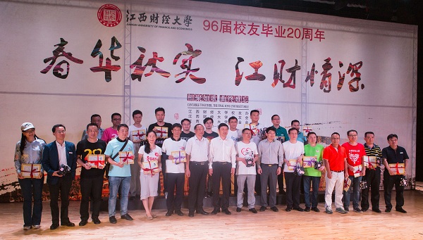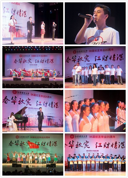 由江财大学生艺术团和1996届校友共同策划的文艺汇演把联谊会推向高潮。诗朗诵《江财颂歌》热情豪迈,唱响江财赞歌;藏族同学的锅庄奔放热情,钢琴演奏悠美动听,小合唱温婉动人,充分地展示了江财学子的多才多艺;96届经济信息刘宾山的歌声饱含深情,特别是96届证券班同学自创自演的班歌《江财魂》引起了校友的强烈共鸣,让校友回到了20多年前的大学时光;歌曲串烧让我们在老歌中回忆青春。晚会在1996届金融1班的大合唱《相逢是首歌》中结束,相聚如歌,曲终难忘,毕业20周年的相聚让校友们的人生增添了最动情的一页。