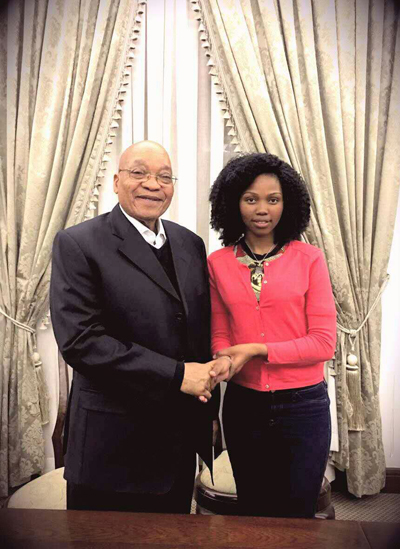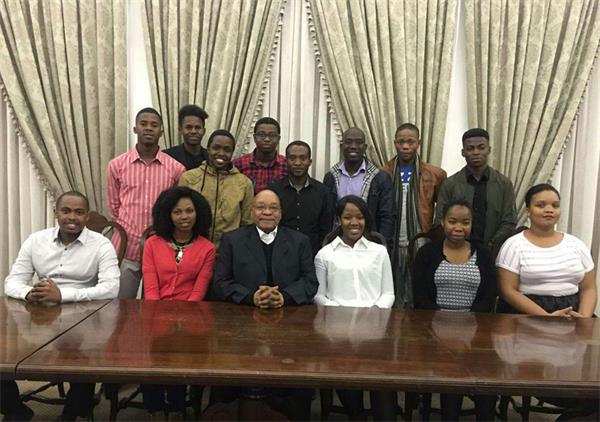 近日,我校在南非的合作伙伴南非中国文化和国际教育交流中心传来消息,在我校学习的四位南非留学生Nokwazi Marry-Angel Zuma,Sthembiso Phumlani Mdladla,Sandile Selby Mthehwa,Banele Andile Mathenjwa于今年假期回国期间受到南非总统祖玛的热情接待。祖玛总统关切询问同学们在华期间的学习生活,鼓励同学们多深入中国社会,多了解中国文化,学习好汉语及专业知识,学有所成后为中南两国的交流和发展做出应有贡献。