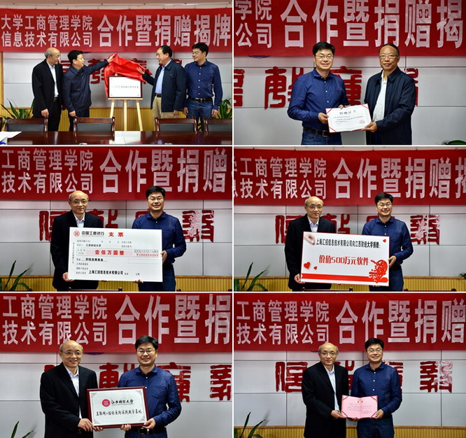 会上,阙善栋代表学校与上海汇招信息技术有限公司正式签约,并颁发捐赠证书。工商管理学院院长胡宇辰接受捐赠方现金支票和捐赠牌。双方代表共同为实验室揭牌,并向易招标授予实践教学基地铭牌。