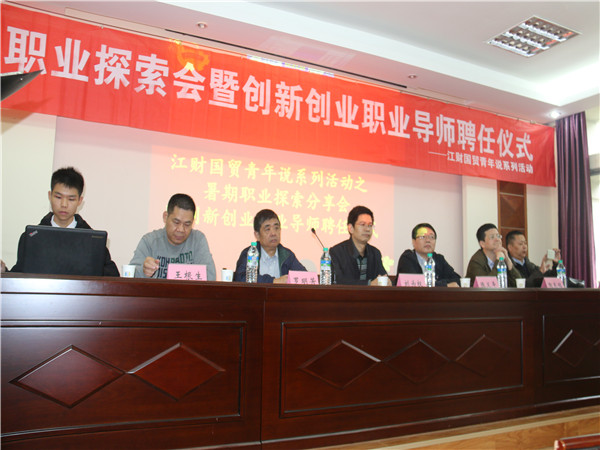 10月29日上午,国贸青年说之暑期职业探索分享会暨创新创业职业导师聘任仪式举行。出席此次活动领导及嘉宾有江中集团党委委员、财务总监刘为权,省国资委第七监事会主任陈义平,南昌市商务局副局长陶东铭,江西来融金融信息服务有限公司副总经理秦晋,南昌金泰国际贸易有限公司总经理谭胜难,国贸学院党委书记罗明芳,副院长王根生及2014级创新实验班班主任汤晓军。