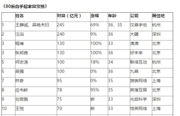 胡润研究院发布的胡润百富榜子榜之一《2016胡润80后富豪榜》,这是胡润研究院首次正式发布此榜单。榜单中,68位80后企业家财富达到20亿元及以上,登上《2016碧桂园森林城市胡润百富榜》,比去年多12位。其中21位是白手起家的。(图文/付凤莲 编辑/匡琳)