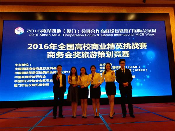 11月7日至9日,2016年全国高校商业精英挑战赛商务会奖旅游策划大赛总决赛在福建厦门落幕。本次大赛由中国国际贸易促进委员会商业行业分会,中国会展经济研究会,中国旅行社协会会奖专业委员会,厦门市会议展览事务局联合主办,中国国际贸易促进委员会商业行业分会教育培训部承办。来自中山大学、北京第二外国语大学、四川旅游学院等全国87支高等院校组成的代表队参加了此次决赛。由徐克帅博士带队的旅城学院旅游管理专业林于坚、王丹婷、支钰婷、杨惠蕊、李萌丽等5位同学首次参赛,并一举荣获“2016年全国高校商业精英挑战赛商务会奖旅游策划大赛” 二等奖。(图文/旅游与城市管理学院 编辑/匡琳)
