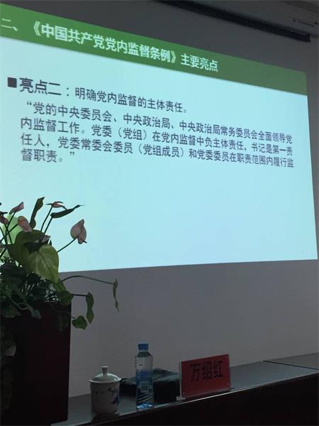 万绍红分析了党的十八届六中全会召开的背景,意义,阐述了“党的建设”在“六位一体”中对于其他五个基本建设的压墙石作用。万博士对坚定不移推进从严治党,全面加强和改进党内政治生活,全面落实党内监督等方面对十八届六中全会精神进行宣讲,重点就《关于新形势下的党内政治生活的若干准则》中闪现的九个亮点和《中国共产党党内监督条例》中闪现的五个亮点作了深刻具体的解读。