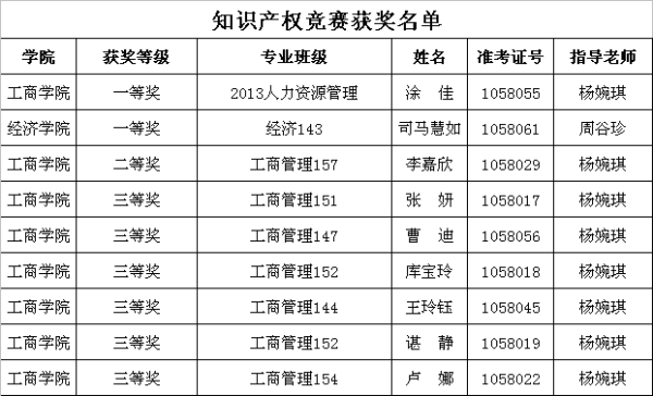 在创业教育学院的组织下,工商学院、经济学院、旅城学院、艺术学院的大力支持和配合,我校有58名非法律专业的本科生参加了由江西省教育厅、江西省知识产权局主办,江西省高等院校科技开发办公室、江西机电职业技术学院总承办,江西现代职业技术学院承办的2016年江西省知识产权(专利)知识竞赛。在各位指导老师的精心指导下,同学们共同努力,我校取得了可喜的成绩,在全省参赛的2187名学生中,共荣获了一等奖2名,二等奖1名,三等奖6名;其中工商学院杨婉琪老师指导的学生涂佳和经济学院周谷珍老师指导的学生司马慧如荣获一等奖。