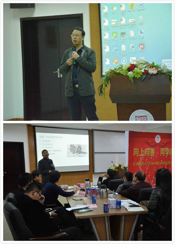 工商管理学院刘爱军教授从述说自己与2009EMBA同学这7年来共同成长的经历说起,一起分享了自己的研究成果《从管理走向治理:加强组织能力建设》,广征博引,通过历史发展的轨迹和历代商界发展的规律,多次提及习近平总书记的“青年时光飞逝,时间都去哪了”的关键词语,总结当今社会企业的制度管理的弊端,并提出自己的看法。他强调“公司治理大于公司管理和组织能力大于个人能力”,并多次举例各大龙头行业如何看待核心员工和企业发展的治理方法。刘教授渊博的学识、风趣的演讲、犀利的见解,让同学们又重回到当年上课时的情景,许多同学都为之动容,掌声久久不能停息。