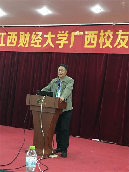 广西校友会会长沈铭明在庆典聚会上讲话,他回顾在广西校友会成立十周年的发展历程,在两届校友会会长带领下,广西校友会不断发展,迅速壮大,目前广西校友会在册校友已700多人,并在14个地市成立了市级分会。校友会不定期地举行足球比赛、迎新会等,校友会已成为广西江财人的精神家园。