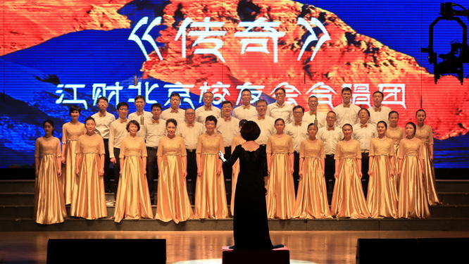 诗以言志,歌为心声。由李健作曲、刘兵作词、王菲演唱的《传奇》,原本讲的是一段感人的爱情故事,经北京校友会合唱团深情演绎后,通过“天边”、“眼前”、“脑海”、“心田”几个慨念将空间拉开,表现了江财十几万校友对母校的思念无处不在、无时不在的境界。合唱队员用两个“宁愿”表达了天南海北、绵延几代的江财校友对母校无尽的爱和深深的眷恋。
