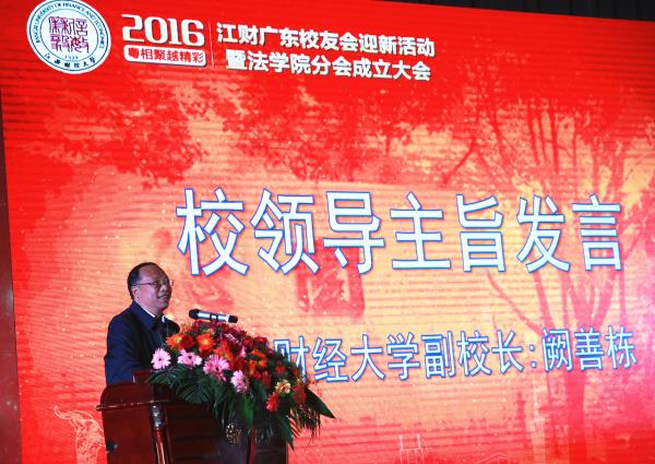 在嘹亮恢宏的校歌声中,大会正式拉开帷幕。阙善栋代表学校致辞。他对江财广东校友会2016年迎新会暨法学院分会成立表示祝贺。他高度肯定了长期以来在粤校友和广东校友会在政商产学等地方经济和行业发展各领域的突出表现以及广东校友会在学校校友工作的领头羊作用。他指出,校友工作始终是我校一张校园文化的靓丽名片、一笔学校发展宝贵的财富、一股事业发展的不竭动力,校友的成就鼓舞着广大师生继续朝着“百年江财梦”砥砺前行,校友的支持帮助着学校在学科建设、事业发展、学生就业等多个方面取得了长足的进步。江财校友“聚是一团火,散是满天星”,希望包括2016年新加入校友会大家庭的校友在内的全体校友一道,珍惜宝贵的校友情谊,一如既往地关注、支持目标,为学院和母校的发展支援呐喊、添砖加瓦。