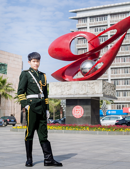 初入国旗队,他只是一名普通队员,但自他决定加入国旗队时,就对这支队伍有了特别的感情。每当国歌奏响,看着鲜艳的五星红旗在明媚的阳光下迎风飘扬,他就有着满满的自豪感。从丹桂飘香到金菊凌霜,他在一个特定的时间,在一个特定的地点,做着同一件庄严神圣的事情。他坚持下来了,而且这一坚持就是一年。或许就因为这种坚持,他的优异表现逐渐进入国旗队帅永豪大队长的视线,使得他成为零点升旗出勤名单上的第一人。一次次训练浸湿的衣服,一个个脚印伴随的腿肿,只为在万千师生心中留下一个难忘的瞬间。终于,他站在2014年元旦零点升旗的舞台上,用热血抵御冬夜的寒冷,在全校师生期待的目光中,身着戎装,步履铿锵,踏出了青春的最美乐章。