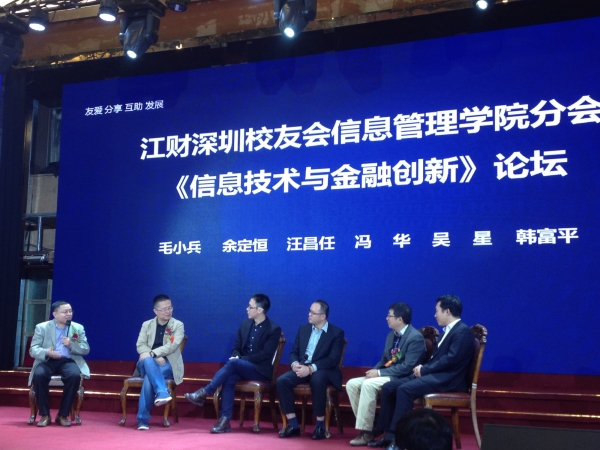 主题演讲的余韵未散,“信息科技与金融创新”高峰论坛紧接着开始,论坛由信息管理学院院长毛小兵主持,深圳市翼虎投资管理有限公司创始人余定恒、北京英物智联科技有限公司CEO汪昌任、深圳市创业导师冯华、深圳市凯丰投资管理有限公司创始人吴星、深圳市搜了网络科技股份有限公司创始人韩富平等信息管理学院在深杰出校友担任嘉宾,分享各自在信息科技与金融创新方面的丰富经验与独特见解,论坛在如火如荼的学术交流中进行着……(图文/信息管理学院 编辑/姜莹)