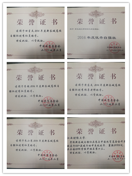 在新长城自强社社长培训班闭营颁奖仪式上,我校自强社凭借优异的表现在全国百所高校中脱颖而出,荣获“2016年度优秀自强社”称号。因在善行100·温暖行动全国公益社团中取得优异成绩,社团指导老师黄应足荣获“2016年度新长城高校自强社优秀指导老师”称号,社员朱小慧、李超、田星太获得“2016年度新长城高校优秀社员”称号。