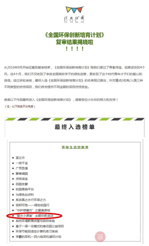 近日,由中国环保公益“绿动未来”推出的《全国环保创新培育计划》评选结果揭晓,江西财经大学绿派社“‘爱水小课堂’主题环教活动”成功入选环保生活创新类优秀扶持项目。绿动未来环保公益众筹平台是由中国环境文化促进会联合上汽通用汽车有限公司共同主办,旨在弘扬生态文明,传播环境文化,同时也是中国第一个环保公益众筹平台。