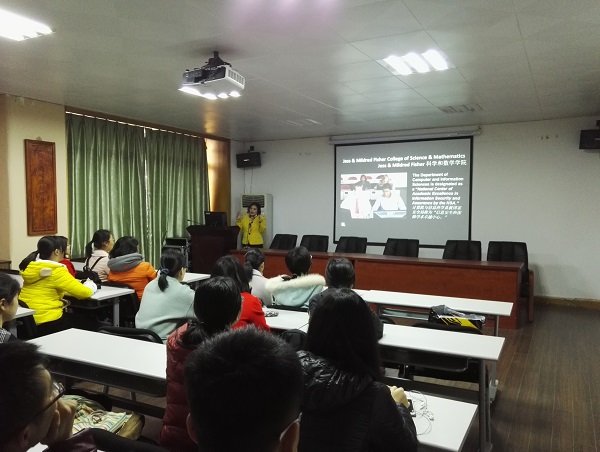 27日下午,Dr. Saleha Suleman在统计学院召开专题讲座,为广大师生详细介绍了陶森大学的历史,同时为大家展示了该校完善的教学设施、强大的师资力量、广泛的生源以及丰富的校园活动。Dr. Saleha Suleman还对“2+2”项目的学费、奖学金和申请流程进行了细致阐述,并代表陶森大学向江西财经大学优秀学子赴美交流、访学表示欢迎。期间,学生代表就申请留学的程序、所开设专业、当地风情地貌等与Dr. Saleha Suleman展开交流。 (图文/谢天韵 编辑/匡琳)