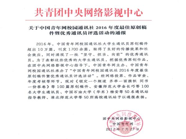 3月2日上午,团中央网络影视中心中国青年网公布“关于中国青年网校园通讯社2016年度最佳原创稿件暨优秀通讯员评选活动的通报”。我校斩获多项殊荣并被评为“中国青年网校园通讯社2016年度优秀通讯站”,校团委匡仁相老师获得“中国青年网校园通讯社2016年度优秀指导教师”荣誉称号,软件与通信工程学院赖林权以及旅游与城市管理学院戴凡媛双双入选“中国青年网校园通讯社2016年度优秀通讯员”,此外,赖林权撰写的《大学,你有真正的朋友吗?》荣获“中国青年网校园通讯社2016年度最佳原创奖”。