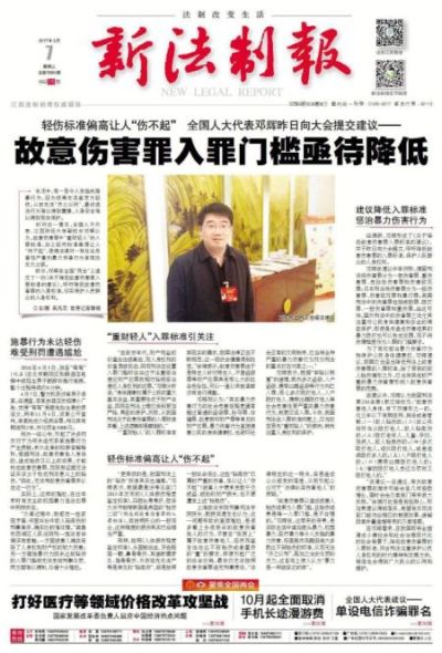 日前,全国人大代表、我校副校长邓辉在全国两会上接受记者采访时表示。3月6日,邓辉代表正式向人大会递交《关于降低故意伤害罪入罪标准的建议》,引发采访报道全国两会的新闻媒体和法学界、业界的热议。今日出版的《新法制报》头版,以《轻伤标准偏高让人“伤不起” 全国人大代表邓辉昨日向大会提交建议(引题)故意伤害罪入罪门槛亟待降低(正题)》为题(吴凡云 首席记者郭俊),用整版篇幅聚焦邓辉代表这一议案。