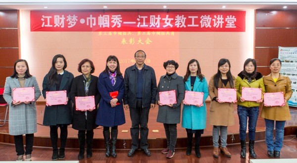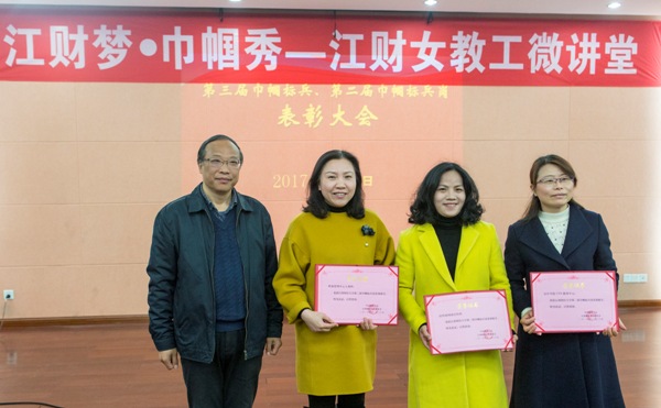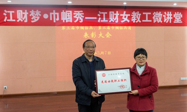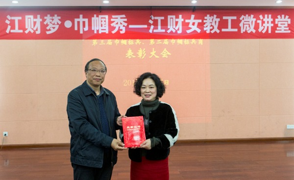 阙善栋还为获奖代表颁奖。学校女教职工委员会喜获“江西省教育系统先进女教职工组织”荣誉称号,刘志蓉老师喜获“江西省教育系统先进女教职工个人”荣誉称号,宣传部网络宣传科、档案管理中心人事科、会计学院CPA教育中心喜获“第二届巾帼标兵岗”荣誉称号,丁智慧、孙爱霞、肖珑、张雅娟、宋丽萍、周玫、周海燕、林冰虹、涂艳、魏丽艳等10位同志喜获“第三届巾帼标兵”荣誉称号。