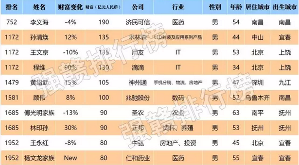 据榜单数据显示,有10位江西籍富豪上榜2017胡润全球富豪榜,财富总值达1135亿元,占到2016年江西生产总值的6.2%。据强赣排行榜之前发布的数据,2016年,新余、萍乡、景德镇、鹰潭4地市的生产总值均未超过1100亿元。其中,54岁的李义海以190亿财富摘得2017胡润全球富豪榜江西籍首富,全球排名752位,比去年下降70位。44岁的孙清焕、53岁的王文京以135亿元财富并列江西籍富豪第二,全球排名均为1172位。
