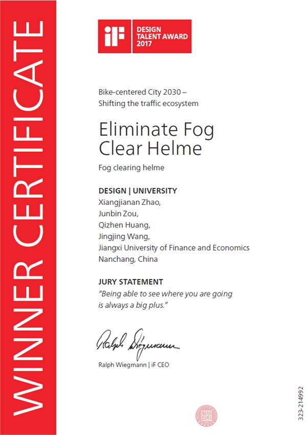 本次iF设计新秀奖共设4个参赛主题。我校学生结合其中的“Bike-centered City 2030”这一主题,与目前中国面临的严重环境问题联系起来,对未来出行方式和可穿戴设备进行大胆创想,将头盔、防霾、图像处理与数据分析创造性的结合起来,设计出作品“Eliminate Fog · Clear Helmet”,最终斩获大奖。正如大赛评委认为的那样,这个创新作品可以预测大气粒子的浓度,进而减少低能见度时的粒子遮蔽效果,并提高色彩饱和度,同时将所拍摄的雾影最快的修复成清晰且高能见度的图像。该作品将会在位于德国汉堡的iF设计博物馆、iF设计奖官方网站和iF设计奖官方APP中进行展示。