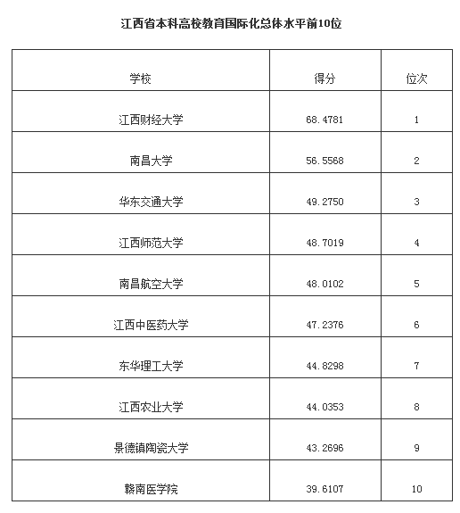 4月13日,江西省教育厅公布我省本科高校教育国际化水平排行榜,我校总体水平位列第一。南昌大学、华东交通大学、江西师范大学、南昌航空大学、江西中医药大学、东华理工大学、江西农业大学、景德镇陶瓷大学、赣南医学院分列我省本科高校教育国际化水平2至10位。