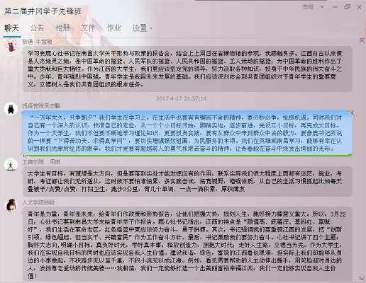 本次线上讨论是先锋班党员活动在形式上的新探索、新发现,是新媒体融入大学生党建的创新示范,是党员发声宣扬党的知识的良好表率。在今后的日子里,作为拥抱大时代的青年学子,作为党员模范,先锋班学员更会谨记鹿书记对我们青年提出的“要做胸怀理想的有志青年,要珍惜时间做一名实干的青年,要释放创造力拥抱大时代,走好人生路立德当为先”的四点殷切期望,做践行社会主义核心价值观的领路人。(图文/第二期井冈学子先锋班 编辑/匡琳)