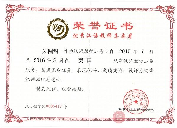 朱圆甜老师的工作表现,先后多次受到国家汉办美方合作机构——美国大学理事会项目负责人、任教学校校长、学区学监等各级领导的公开表扬。同时也最大限度促进了汉语和中国文化在当地的传播,出色完成了“汉语教师志愿者”光荣使命。任教期间,她先后两次被美国大学理事会评选为赴美项目“每月之星”,2016年4月被RVHS评为全校唯一的月度教学明星,2016年5月获得学校“杰出教育贡献奖”称号。她在当地组织的文化活动,先后两次被学校电视台编辑报道。此外,她还应邀出席了2016年度全美中文大会,并做大会报告,交流成功经验。