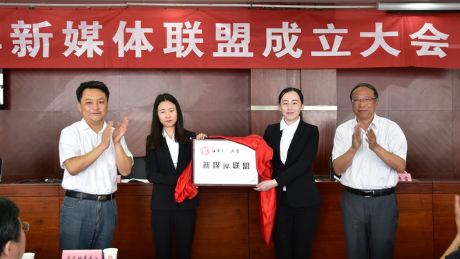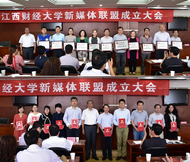 阙善栋为江西财经大学新媒体联盟揭牌,为联盟理事长、副理事长单位授牌。
