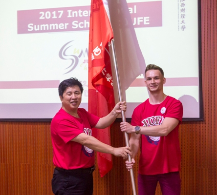 开班仪式的最后,王小平将具有“江财红”特色的国际夏令营营旗授给外籍学生代表,预祝夏令营的所有活动都能圆满举行。