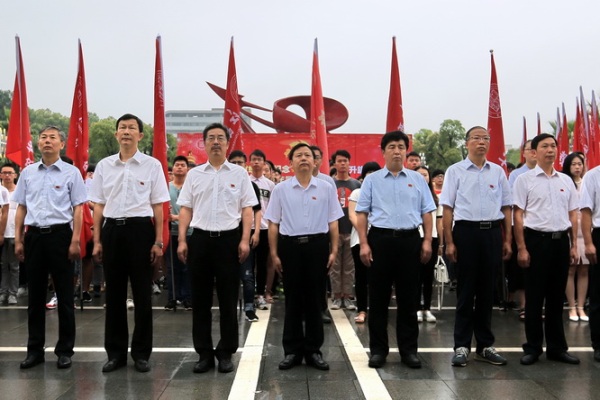 6月30日,我校庆祝建党96周年升旗仪式由党委宣传部牵头组织实施。校长卢福财、副校长蒋金法、王小平、阙善栋、欧阳康出席。崛起广场上,在嘹亮的国歌声中,鲜艳的五星红旗冉冉升起,师生党员和入党积极分子庄严肃立,向国旗行注目礼。升旗仪式后,开展了老党员重温入党誓词和新党员宣誓活动。师生党员肃穆站立,庄严地举起右拳,用铮铮宣誓声表达他们对党的无限忠诚和对共产主义的坚定信念。