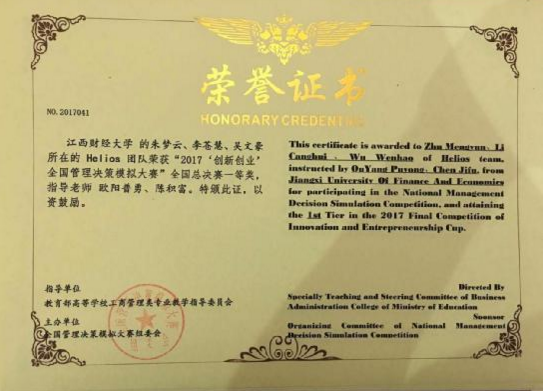 本届全国大学生管理决策模拟大赛启动以来,计算机实践教学中心积极开展相关赛事筹备工作,力求以学科竞赛为抓手,坚持以学生发展为中心的教学理念,构建以能力提升为主线的实验课程体系,探索创业教育走向“实战演练”之路,实现跨专业实验课程和学科竞赛等学、赛一体的分层次、递进式经管类跨专业“立体化“实验课程体系。赛前利用大赛平台积极组织和宣传,组建大赛指导团队,招募校赛参赛队员121人,举办2017 “创新创业”全国管理决策模拟大赛校内选拔赛。历经二个月培训、训练以及校赛、大区赛和半决赛,选拔李苍慧、吴文豪和朱梦云同学组成“Helios”代表队参加全国总决赛,经过激烈角逐,斩获2017全国管理决策模拟大赛总决赛一等奖。