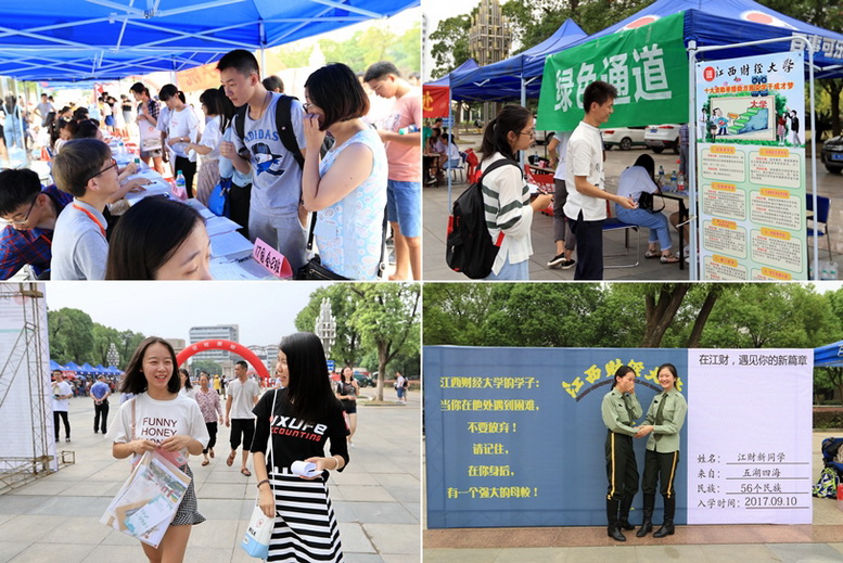 新生全家福、新生征文展、英语角、迎新图片框、江财生活小贴士、手绘江财地图、学院特色橱窗展示、团学工作展板等等不一而足,各学院迎新工作别出心裁、创意多多,让初入江财的学子耳目一新,倍感亲切。