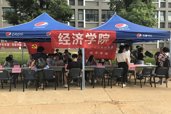 由于宿舍楼翻修,大一新生由本来的蛟桥校区改为了麦庐校区,地区的不熟悉,来回的不方便并没有浇灭学长学姐们对“小鲜肉们”的热情。为了提前适应这一届的种种不便,全体经济学院生会成员在学生会长的的带领下,提前两天便开始了紧锣密鼓的迎新准备工作。早在9月7日,经济学院的学长学姐们便在麦庐园开始了迎新接待点——经济学院大本营的搭建布置工作,搬运桌椅,搭建帐篷,布置展板,经院的“老人”们用他们的热情展示着对“新人”的期待与欢迎。经济学院沿袭了去年“互联网+,信息化迎新”的新模式。新生到达迎新点,只需打开手机二维码或者出示报道证,迎新志愿者使用微信扫描二维码就可以确认报道学生基本信息,信息确认完毕,就有学长学姐带领着去完成激活校园卡、领军训服、入住学生宿舍等一系列报道工作,一站式服务给新生带来许多便利。